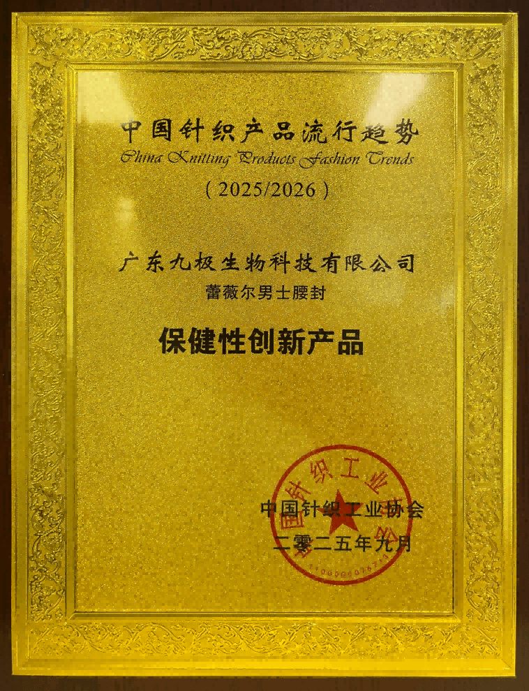 8月,中国针织工业协会官方公布第十届中国针织产品流行趋势入围名单,广东九极生物科技有限公司旗下蕾薇尔男士腰封荣获“保健性创新产品”奖项。